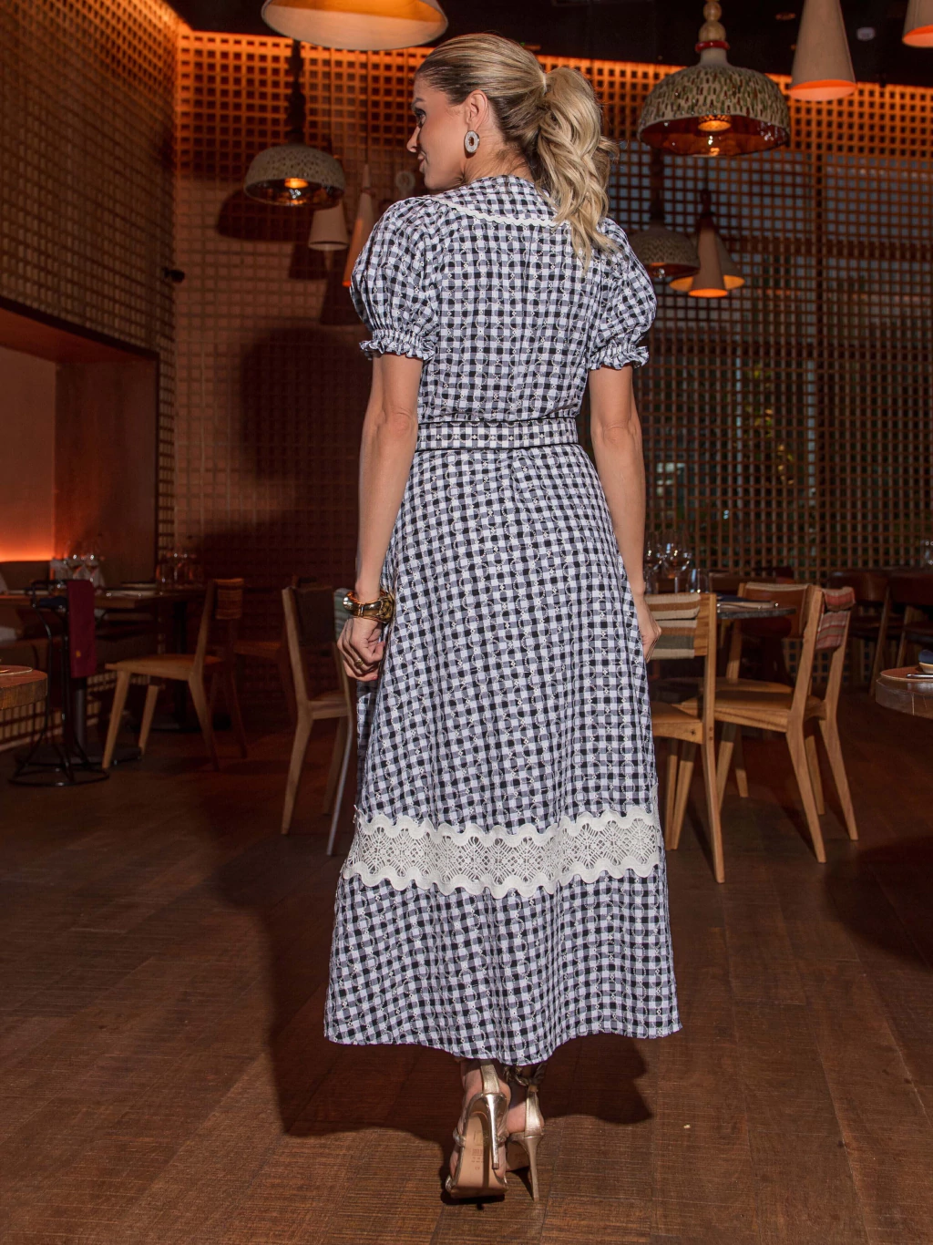 Its shirt-dress silhouette with midi length and V-neckline creates a flattering, elongated shape, while the short puff sleeves add a delicate, feminine touch.