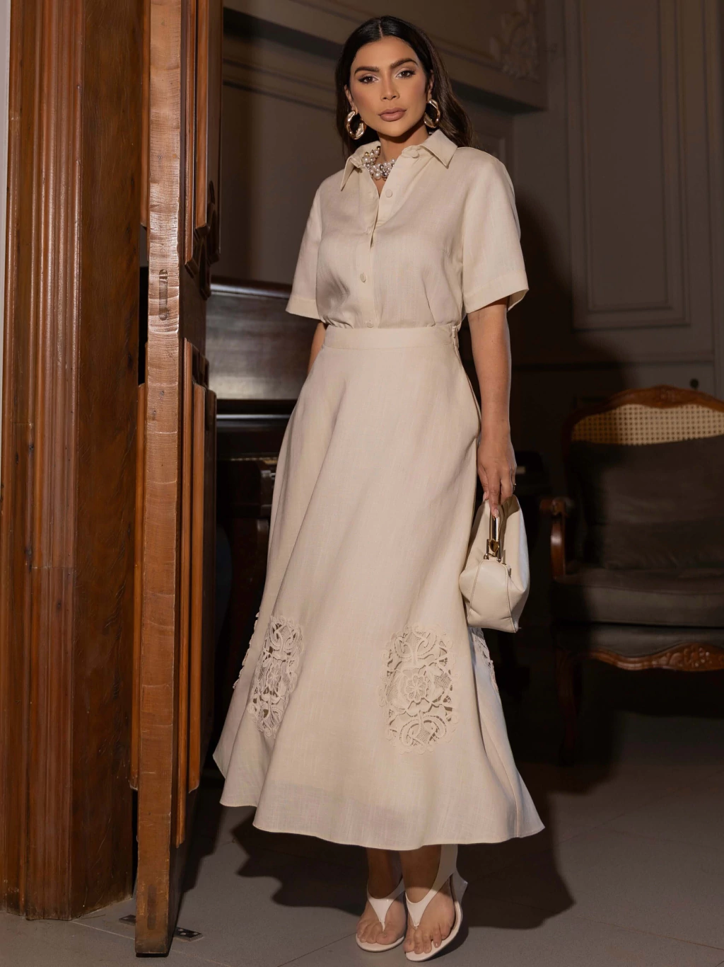 A saia, com modelagem evasê e cintura média, possui comprimento midi, ideal para diversas ocasiões. O destaque fica por conta dos apliques de renda vazado no barrado e do fechamento lateral por zíper, assegurando ajuste perfeito e segurança ao vestir. A peça é forrada, aumentando o conforto.