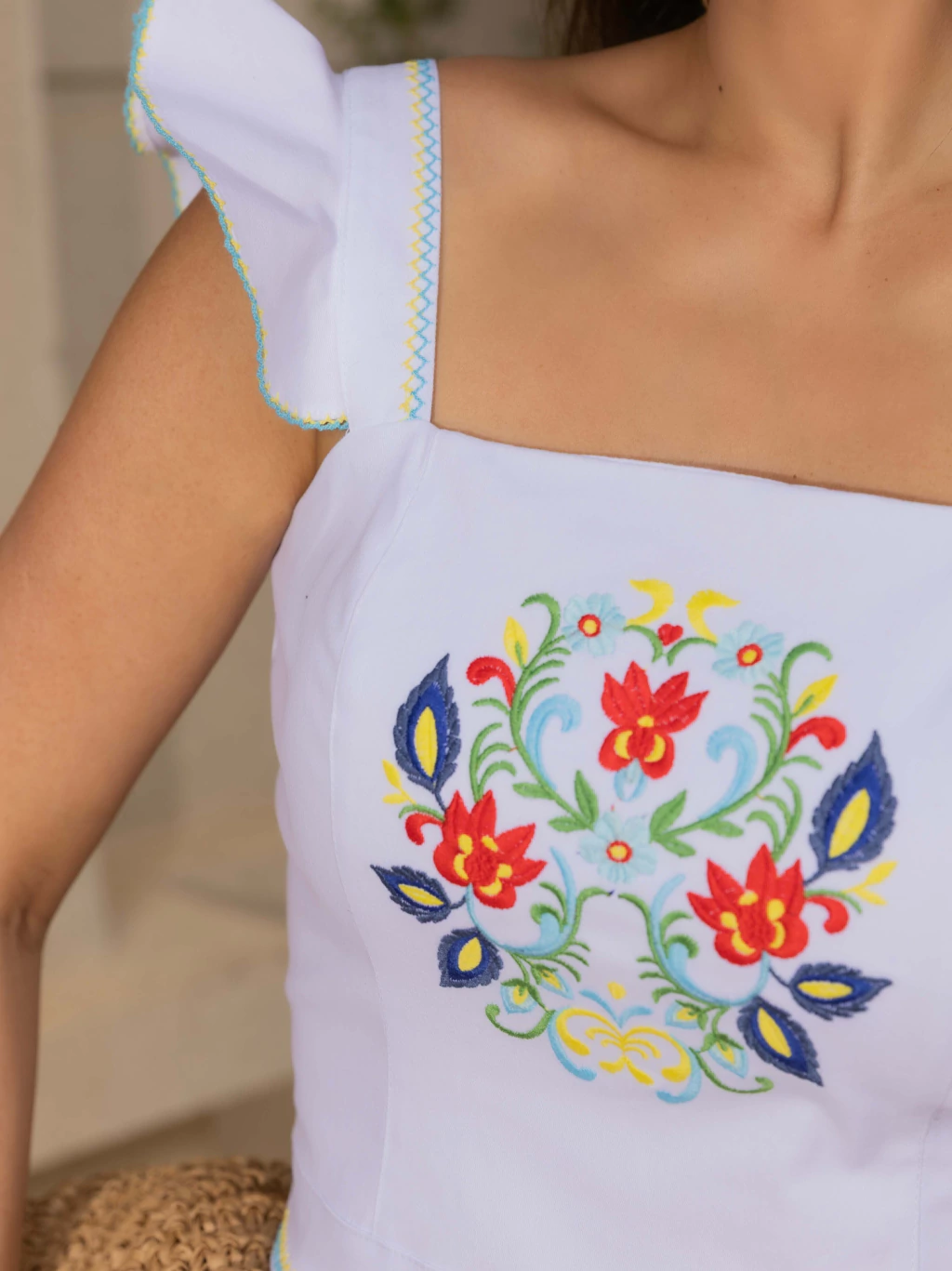 A blusa traz modelagem slim, decote quadrado e alças largas com babadinho bordado, além de bordado de mandala floral na frente. As costas possuem lastex para melhor ajuste e fechamento por zíper de metal personalizado.