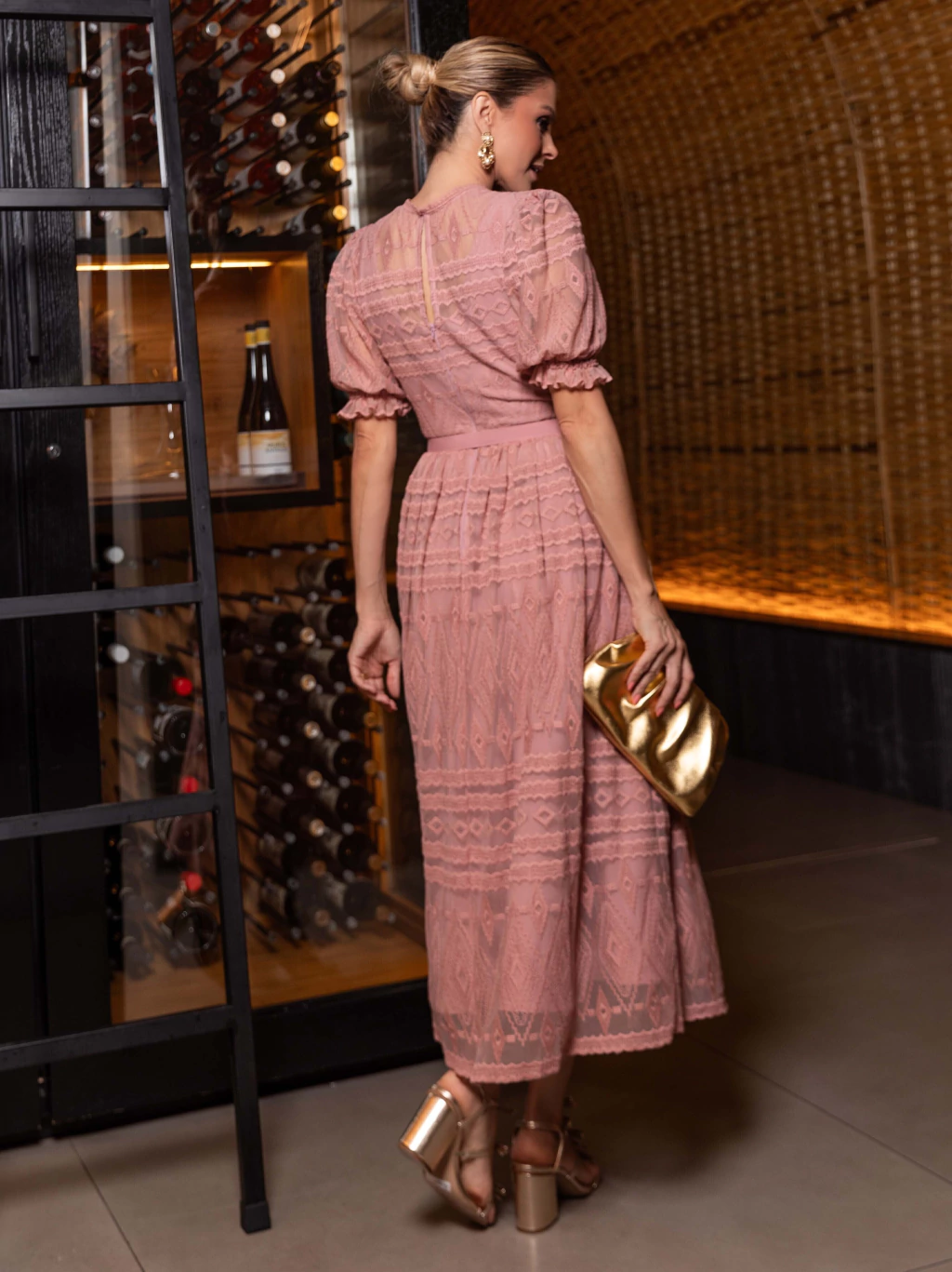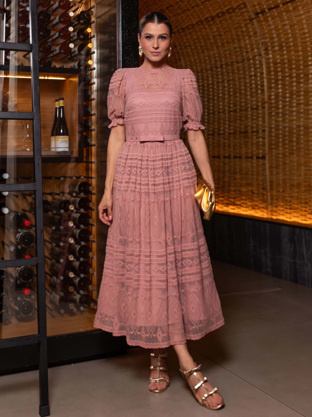 O decote redondo com acabamento de renda biquinho e as mangas curtas levemente bufantes trazem um toque romântico. O punho de elastex garante conforto, e a saia com nesgas proporciona movimento fluido. O fechamento nas costas por zíper e botão forrado facilita o vestir.